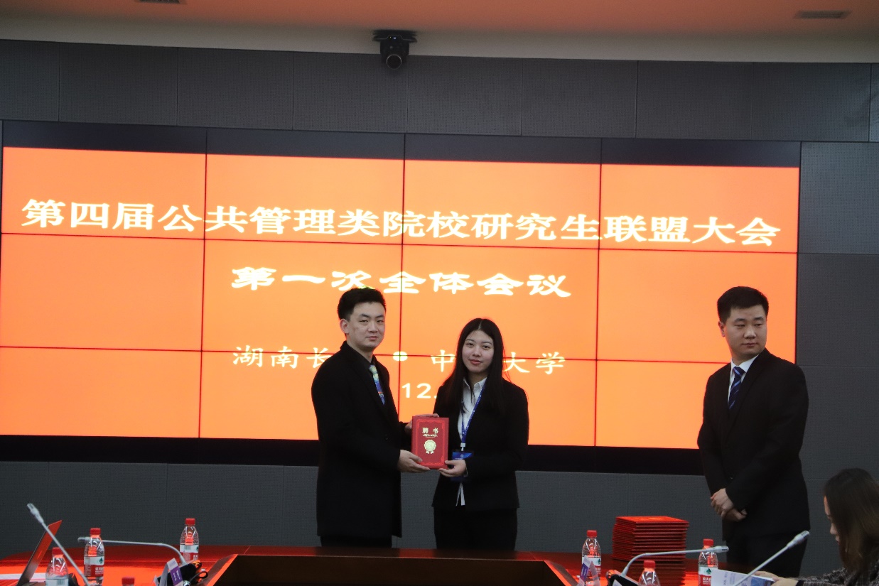 12月1日上午,第四届公共管理类院校研究生联盟理事会在中南大学校本部科研南楼会议室召开,本次联盟大会以“互动交流、合作共享”为主题,旨在搭建各高校公共管理类相关学科交流与合作平台,促进联盟理事单位的交流与合作。在公共管理类院校研究生联盟理事长交接与理事聘书颁发仪式上,黎雲帆同学代表我院研会接受聘书。随后,来自全国高校的研究生代表就联盟章程修改、联盟组织架构、联盟理事会任期、联盟影响力和未来发展方向等问题进行了讨论,由秘书处收集建议修改相关文件后再行发布征求建议。我院研究生代表在讨论中积极发声、建言献策,得到了在场联盟理事的高度赞扬和赞同。