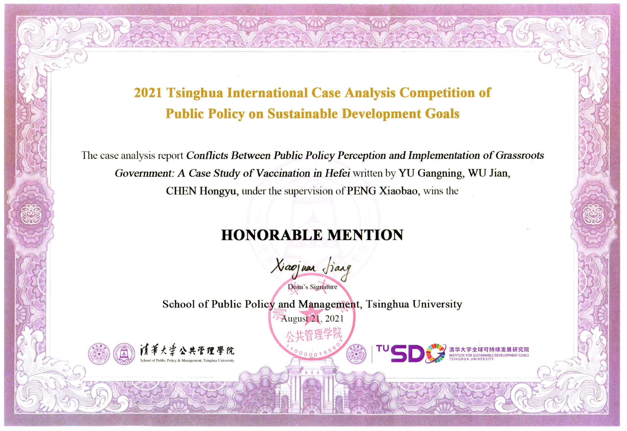 我院研究生在2021年清华大学全球可持续发展目标公共政策案例分析大赛中喜创佳绩