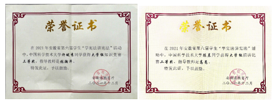 2021年10月19日,安徽省第六届学生“学宪法,讲宪法”比赛活动采用线上与线下的方式进行。在校学工部邵祎康老师的精心组织下,在公共事务学院张瀚洋、高亮两位老师的悉心指导下,我院2021级法律硕士研究生陈晨、许皖秀两名同学代表中国科学技术大学参加比赛。近日比赛结果公布,我院两位同学表现优异,分别获得大学组知识竞赛三等奖、演讲比赛二等奖。