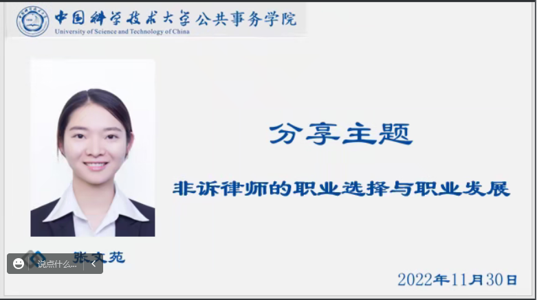 11月30日下午14:30,由公共事务学院主办的就业主题讲座在线上顺利举行。本次活动邀请了我院2012级法硕专业校友张文苑以及2019级公共管理专业校友缪成进行职业介绍及就业经验分享,由2022级法硕专业学生邵静莹主持。