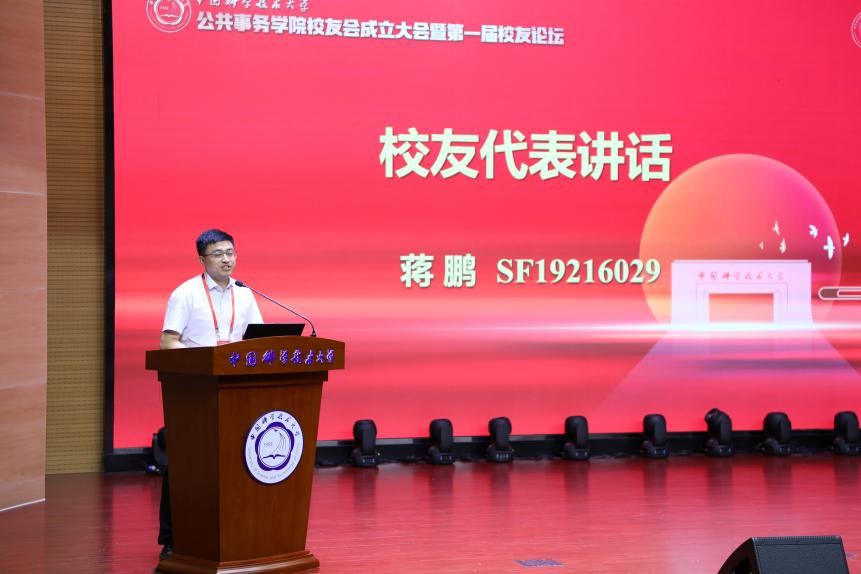 19级MPA蒋鹏作为校友代表发言。他对自己在中国科大公共事务学院过去几年的学习和生活做了深情而幽默的回忆,他期待将来有机会继续回校深造。