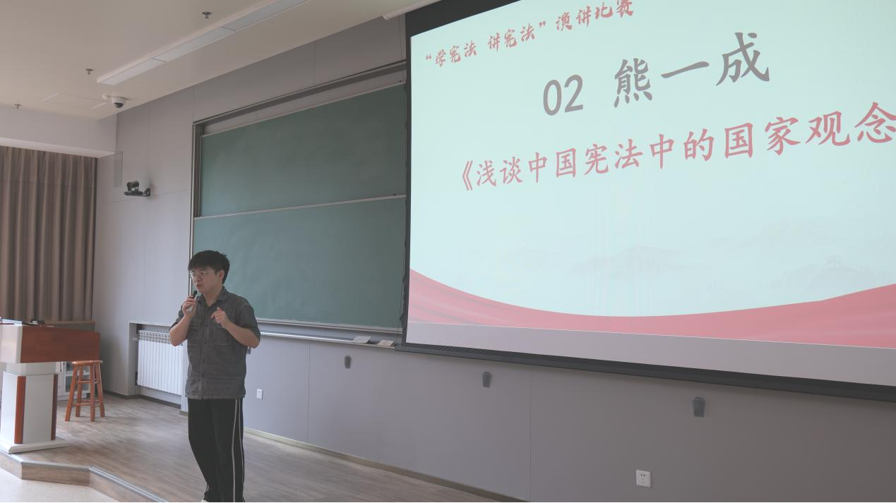 熊一成同学的演讲题目为《浅谈中国宪法中的国家观念》,他通过阅读清华大学法学院林来梵教授所著的《宪法学讲义》,结合时代背景分析社会观念和宪法的关系。