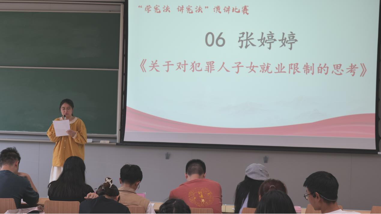 张婷婷同学以《关于对犯罪人子女就业限制的思考》,“时代的一粒灰尘落在一个人头上就是一座山”,通过具体案例,她展示了对宪法不断完善的期待与思考。