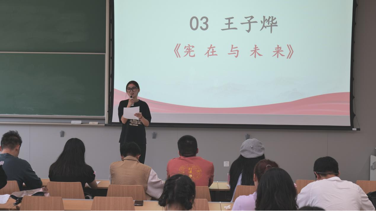 吕承成同学的演讲题目是《追风赶月莫停留,平芜尽处是春山》,她从儿时故事说起,将宪法与时代的发展结合,生动形象地说明宪法体现在勇担责任、恢弘胸怀的大国担当中。