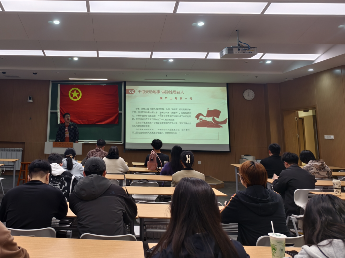 团课伊始,朱谊为大家介绍了爱国科学家——于敏的生平事迹与卓越贡献。于敏是我国著名的核物理学家,他隐姓埋名二十八载,为我国核武器事业从无到有、从弱到强的发展做出了不可磨灭的贡献。朱谊生动地讲述了于敏在艰苦条件下,凭借顽强的毅力和卓越的智慧,攻克重重技术难关,为国家铸就核盾牌的故事。同学们被于敏“两弹一星”精神深深打动,为他无私奉献、勇于担当的爱国情怀所折服,现场不时响起阵阵掌声。