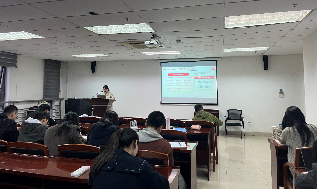 党支部组织委员夏登月同学首先领学2025年全国两会精神。她带领同学们以2025年政府工作报告为核心教材,并结合专业与生活实际,围绕法治人才培养、基层治理创新等议题开展“我为两会提建议”专题讨论,通过原原本本学、融会贯通悟,以政治建设为统揽,以现代化为牵引,以创一流为目标,自觉把思想和行动统一到习近平总书记重要讲话精神和全国“两会”精神的上来。