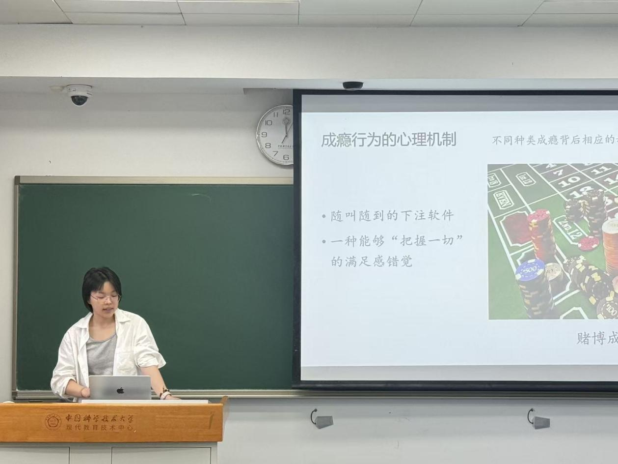 活动伊始,许婧同学详细介绍了常见的成瘾行为,包括赌博、毒品、酒精、手机、游戏、工作及健身等。她从精神动力学角度深入剖析成瘾行为的心理机制,指出“寻觅的本能”是成瘾行为背后的重要心理驱动力。随后,她结合不同动力学理论,对各类成瘾行为背后的心理机制进行了细致解读。许婧同学的讲解深入浅出,引发了同学们的强烈兴趣。在互动环节,同学们积极分享自己的见解和感受,现场气氛热烈。通过朋辈互助与专业引导相结合的方式,同学们对心理健康问题有了更深刻的理解,也学会了如何从心理学角度分析和应对生活中的成瘾行为。