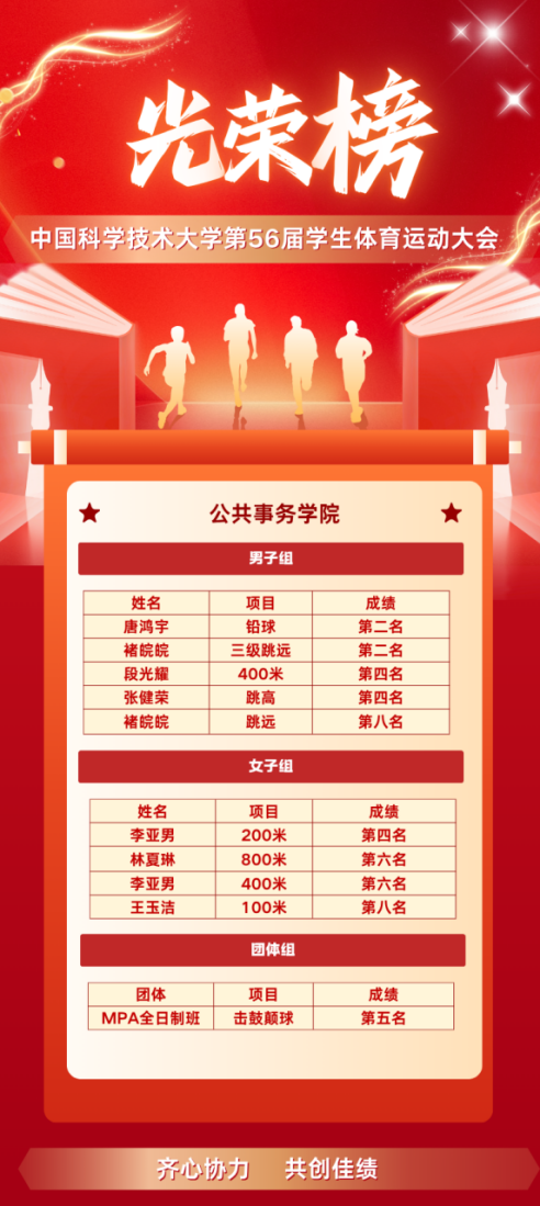 青春激扬秋光里,拼搏奋进正当时。为强壮学生体魄、提高身体素养、彰显青春风采,10月31日-11月1日,中国科学技术大学第56届学生体育运动大会在东校区田径场隆重举行,公共事务学院各年级学子积极参加此次运动会并荣获佳绩。