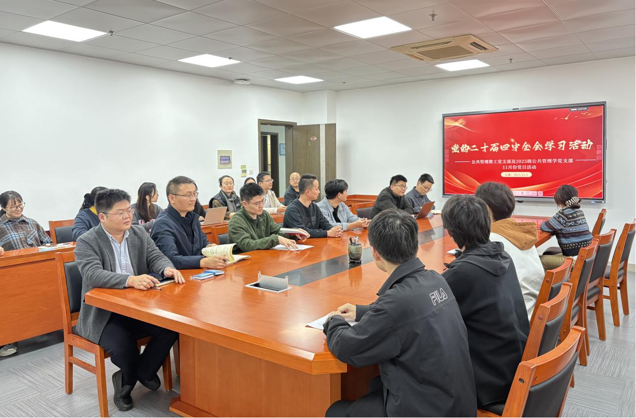 为深入学习贯彻党的二十届四中全会精神,推动党建与人才培养深度融合,11月5日下午,公共管理教工党支部与2025级公共管理学研究生党支部在管理科研楼1108会议室联合开展了学习贯彻党的二十届四中全会精神暨师生交流主题党日活动。学院执行院长魏玖长、党委书记杜少甫以普通党员身份参加。2025级公共管理学研究生党支部书记王梦雅同学主持活动。