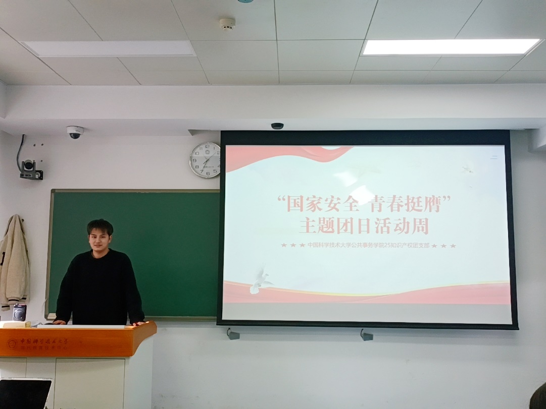 为深入学习贯彻总体国家安全观,引领广大团员青年深刻认识维护国家安全的重要意义,增强忧患意识、勇担时代重任,11月28日,2025级知识产权硕士班团支部在第二教学楼2509教室开展“国家安全 青春挺膺”主题团日活动暨学习习近平总书记重要回信精神主题团课。活动由团支部书记杨晨同学主持,支部全体成员参加。