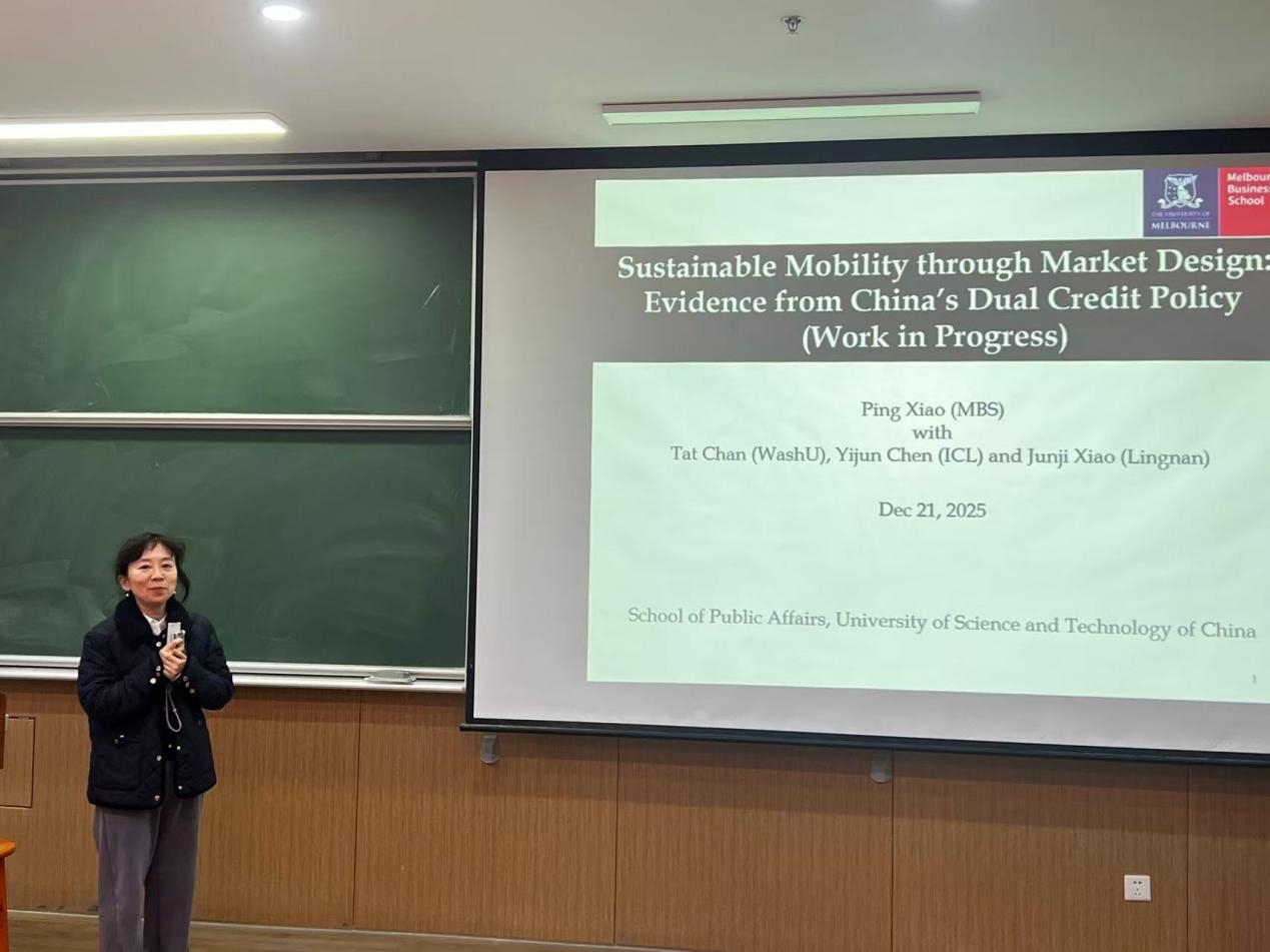 为拓展师生学术视野,深化对政府政策与市场机制协同作用的理解,12月22日下午,墨尔本大学墨尔本商学院副教授肖萍博士受邀来访我院,作题为《Sustainable Mobility through Market Design: Evidence from China’s Dual Credit Policy》的学术报告。讲座由我院执行院长魏玖长教授主持,吸引了院内外师生的踊跃参与。