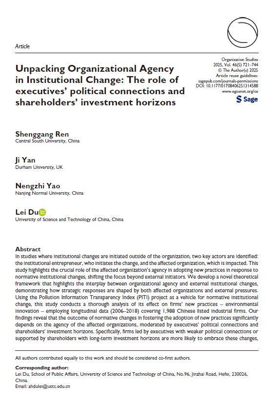 我院杜磊特任副研究员(通讯作者)与杜伦大学颜霁教授等人合作在组织管理领域的国际高水平期刊Organization Studies发表了题为“Unpacking Organizational Agency in Institutional Change: The Role of Executives’ Political Connections and Shareholders’ Investment Horizons”的研究论文。Organization Studies是金融时报(FT)认定的经管类权威杂志50种之一,为ABS 4星期刊和组织管理领域FMS A类期刊,致力于发表对组织管理领域有重大影响的实证和理论研究文章。
