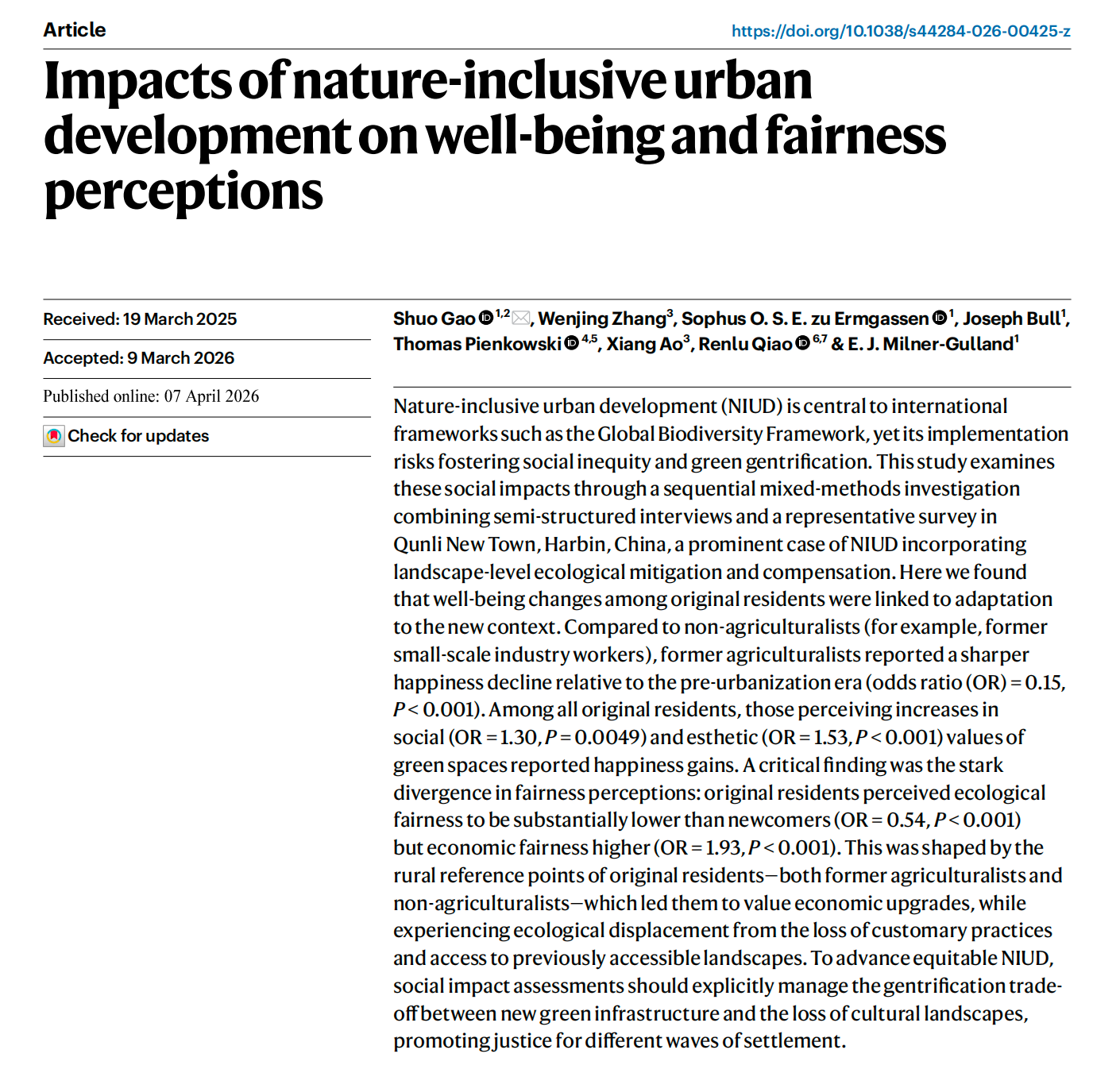 自然包容性城市发展(NIUD)是当前全球城市可持续发展的重要方向,也是我国推进生态文明建设与城市更新行动的关键抓手。近期,中国科学技术大学公共事务学院特任副研究员高硕与牛津大学、帝国理工学院、清华大学、同济大学等多家单位合作,以哈尔滨群力新区为典型案例,采用序列混合研究方法,从空间重构、居民福祉、公平感知等多维度系统考察了自然包容性城市建设的社会效应。研究成果以“Impacts of nature-inclusive urban development on well-being and fairness perceptions”为题发表于Nature子刊《Nature Cities》。