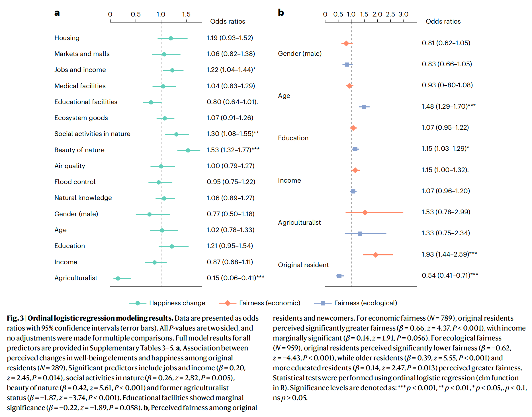 研究显示,原农业从业者的幸福感变化轨迹与其他群体存在异质性,而环境美学感知的增强及社会交往空间的改善,均与居民幸福感的提升呈显著正相关。这表明自然包容性城市建设应注重保留社会交往空间、文化认同载体与生计连续性,以实现居民福祉的综合性提升。02